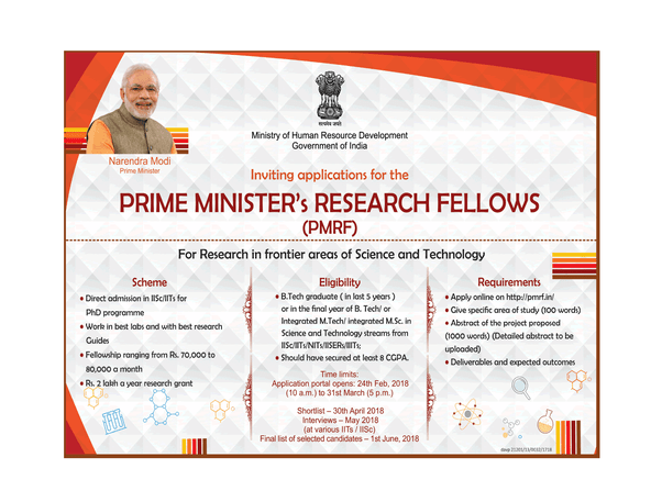 The Union Cabinet on February 7, 2018 had approved implementation of ‘Prime Minister’s Research Fellows (PMRF)’ scheme at a total cost of Rs.1650 crore for a period of seven years beginning 2018-19.