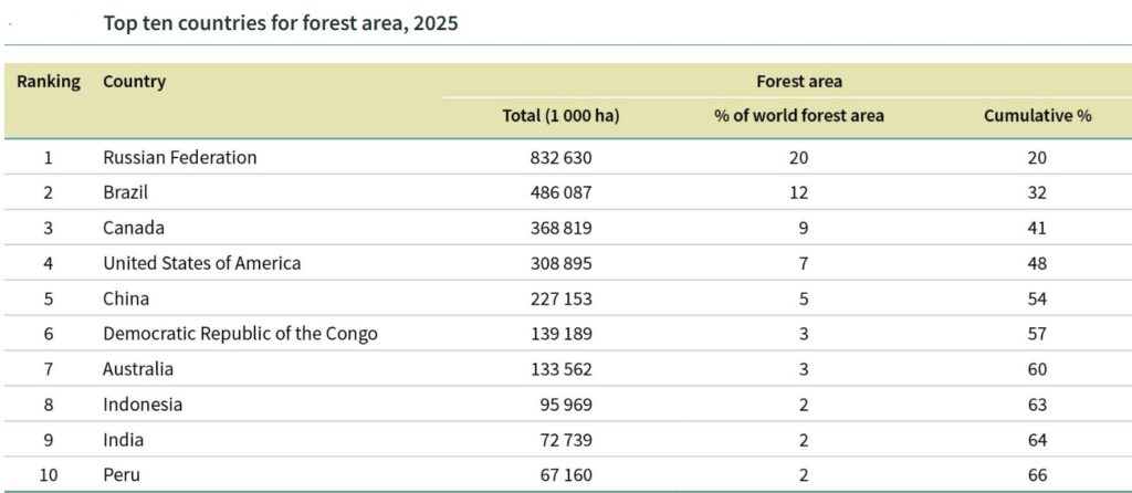 Together, these five nations account for 54% of the world’s total forest area.